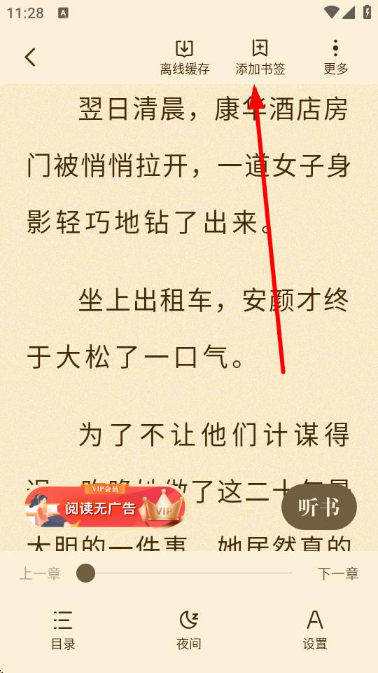 4、在小说阅读界面,点击屏幕,在弹出的功能栏中,点击添加书签按钮,即可将当前页面添加为书签。