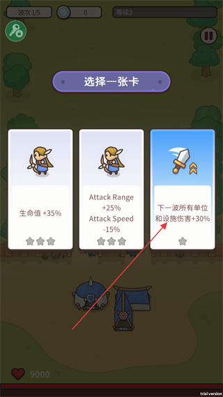 1、在选择一张卡界面选增益卡,如下一波所有单位和设施伤害+30%,强化防御能力。