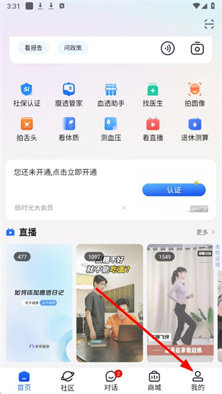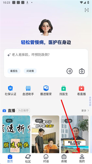 1、在老来健康主界面,点击底部导航栏的我的选项,进入个人页面。