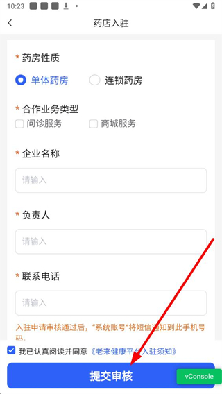 4、依次选择药房性质和合作业务类型,填写信息,勾选同意入驻须知后,点击提交审核完成申请。