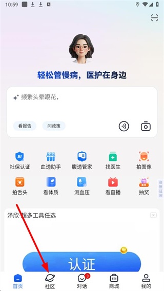 1、打开老来网app,在首页底部功能栏,找到社区选项并点击,进入社区页面。