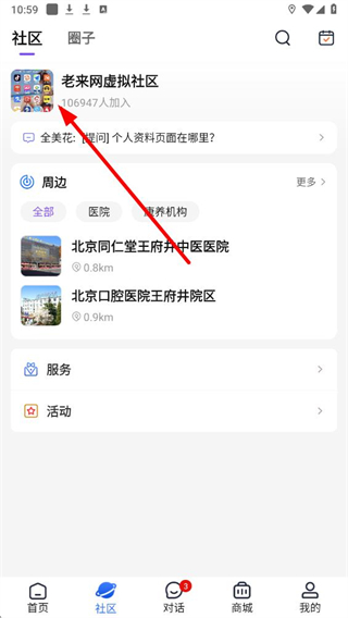 2、在社区页面,找到老来网虚拟社区入口并点击,进入该社区的详情页面。