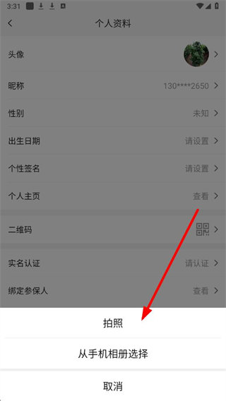 4、在弹出的菜单中,选择拍照或从手机相册选择来获取新头像,完成选择后即可更新个人头像。