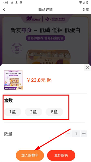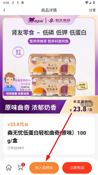 3、在商品详情界面中,点击下方加入购物车的选项按钮。