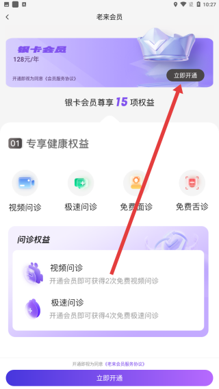 2、在老来会员页面中,点击立即开通按钮开通银卡会员。