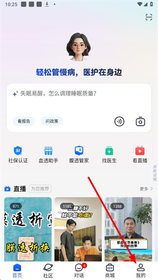 1、在老来健康主界面,点击底部我的选项,进入我的个人页面。