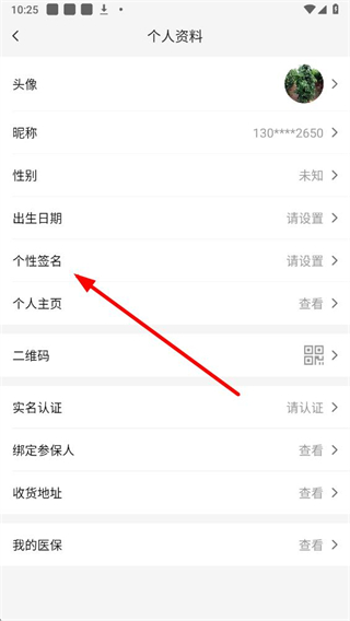 3、在个人资料页面中,选择个性签名选项,进入修改个性签名页面。