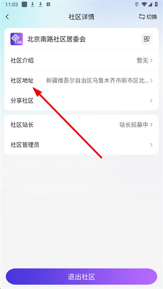 3、在社区详情页面,找到社区地址选项并点击,进入对应信息展示页面。