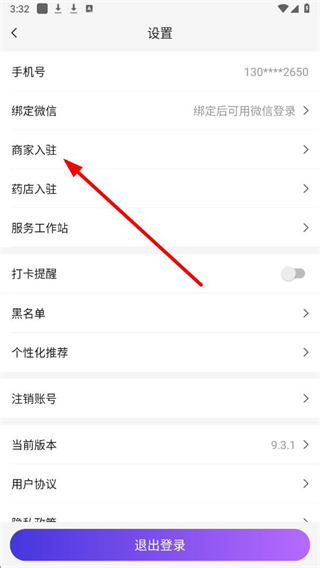 3、在设置页面,点击商家入驻选项,进入商家入驻的信息填写界面。