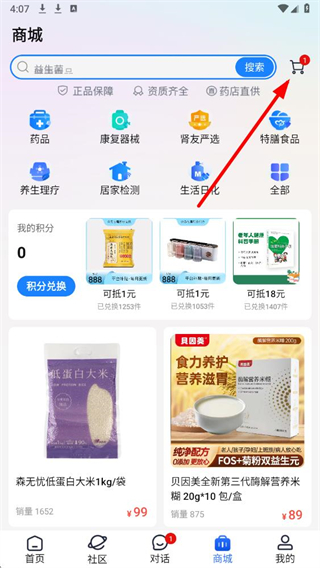 1、在应用首页底部,找到商城选项并点击,进入商城相关操作页面。