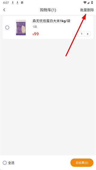 3、在购物车界面中,找到右上角的批量删除选项并点击,进入商品选择状态。
