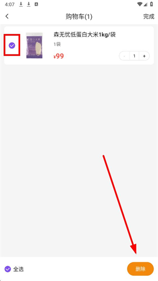 4、勾选要删除的商品后,点击界面底部的删除按钮,即可完成购物车中对应商品的删除操作。
