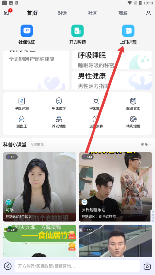 1、在老来网app首页面中,点击上门护理按钮查看详情。