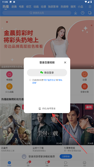 2、当页面显示登录的界面,点击手机/账号登录的按钮。