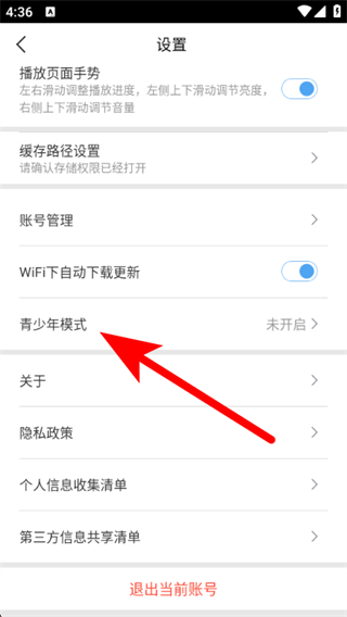 3、在设置页面点击青少年模式,进入是否开启青少年模式页面。