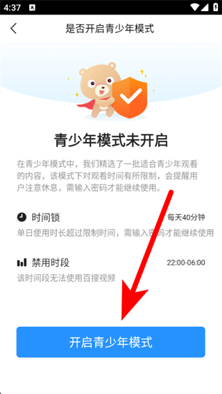 4、在是否开启青少年模式页面点击开启青少年模式,即可开启百搜视频的青少年模式。