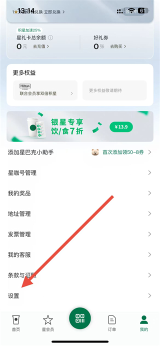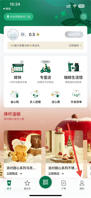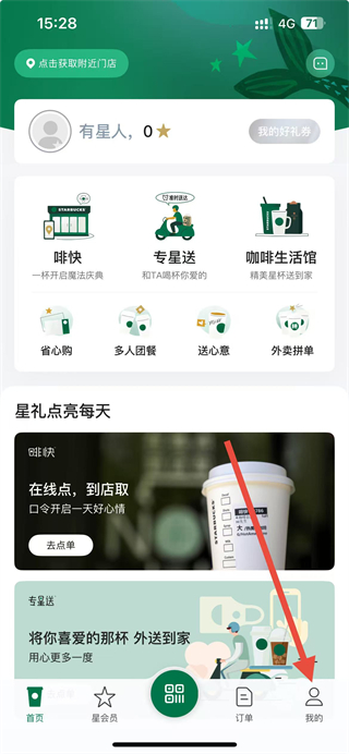 1、在星巴克app主界面底部,点击我的按钮,进入个人页面。