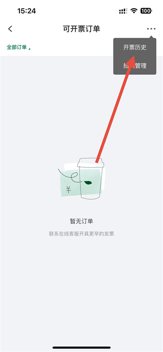 3、在可开票订单页面,点击右上角的三点图标,选择开票历史选项。