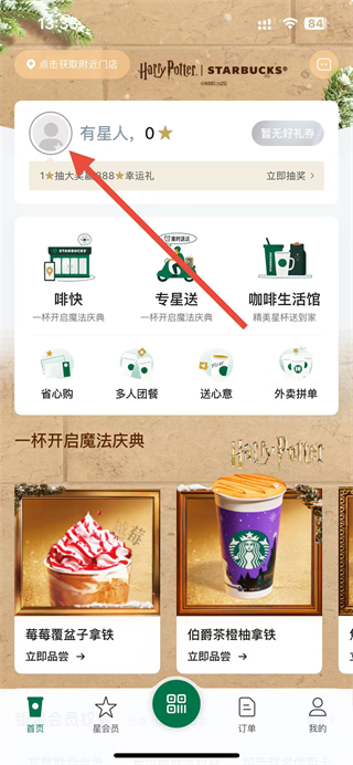 1、打开星巴克app,点击顶部的头像区域,进入个人信息页面。