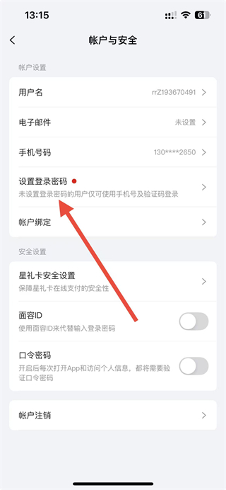 3、在帐户与安全页面,点击设置登录密码选项,触发密码设置流程,按提示操作。