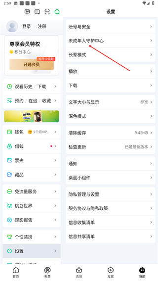 3、在设置页面中,点击未成年人守护中心选项,进入青少年模式管理页面。