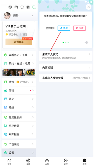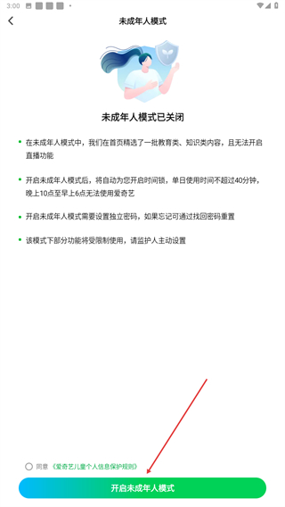 5、在页面中了解协议后,再点击开启未成年人模式按钮,即可启用。