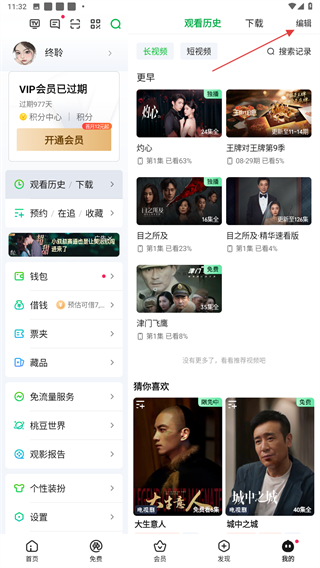 2、进入我的页面内,在右侧观看历史内点击编辑的按钮。