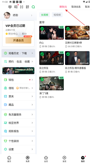 3、勾选要删除的视频记录后,点击删除的按钮即可完成。