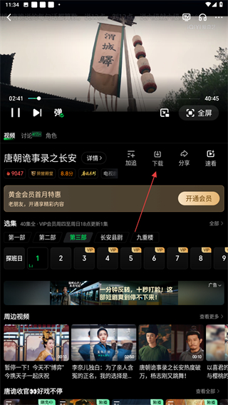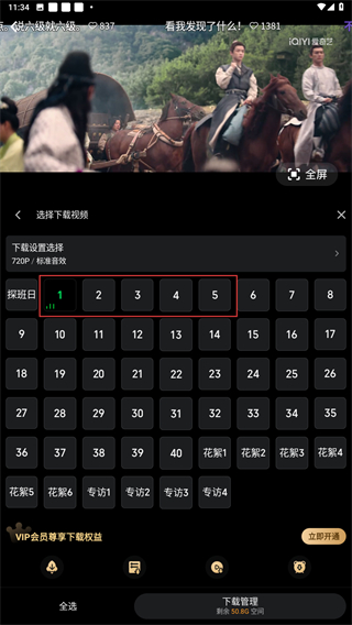 4、在下方弹出的剧集中,滑动可选择多个剧集进行下载。