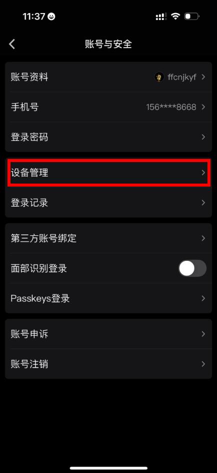 4、在账号与安全界面中,找到并点击设备管理,进入设备管理页面后,就能看到已登录的设备数量及相关设备信息。