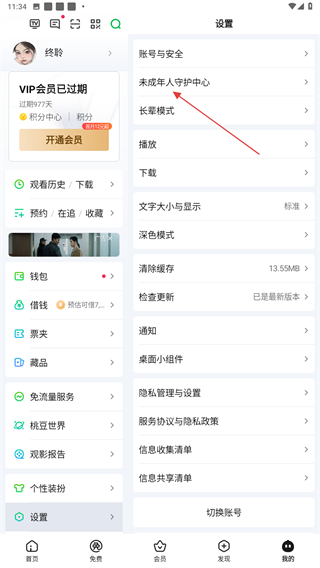 3、在左侧呈现设置的页面,点击未成年人守护中心。