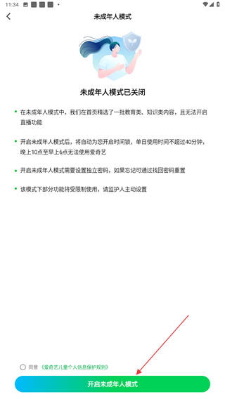 5、了解该模式后,点击下方开启未成年人模式即可。