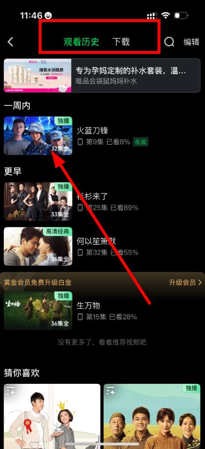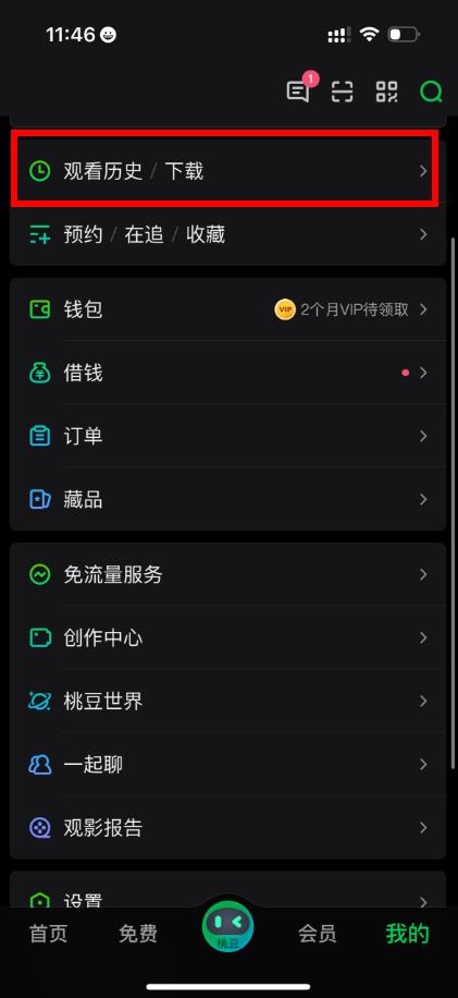 2、在个人界面中,找到并点击观看历史/下载选项进入观看历史页面。
