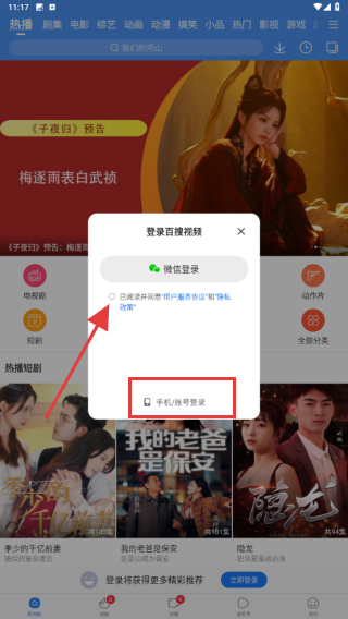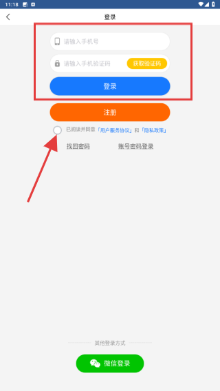 2、点击后触发登录入口,用户需要勾选已阅读并同意用户服务协议、隐私政策选项,并使用手机账号登录。