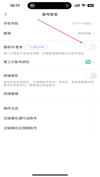 3、进入账号安全的界面内,在面容ID登录右侧开启按钮即可。