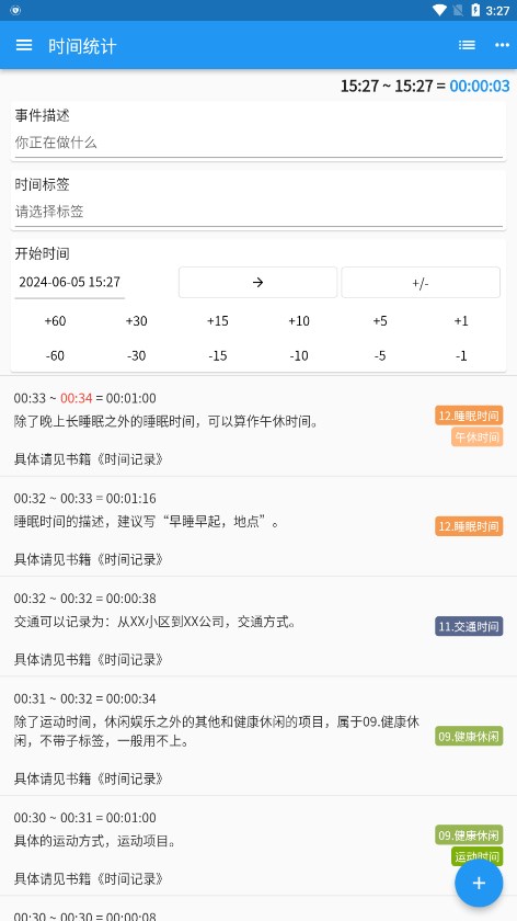 1. 时间记录:用户可手动输入或选择预设活动进行时间记录。