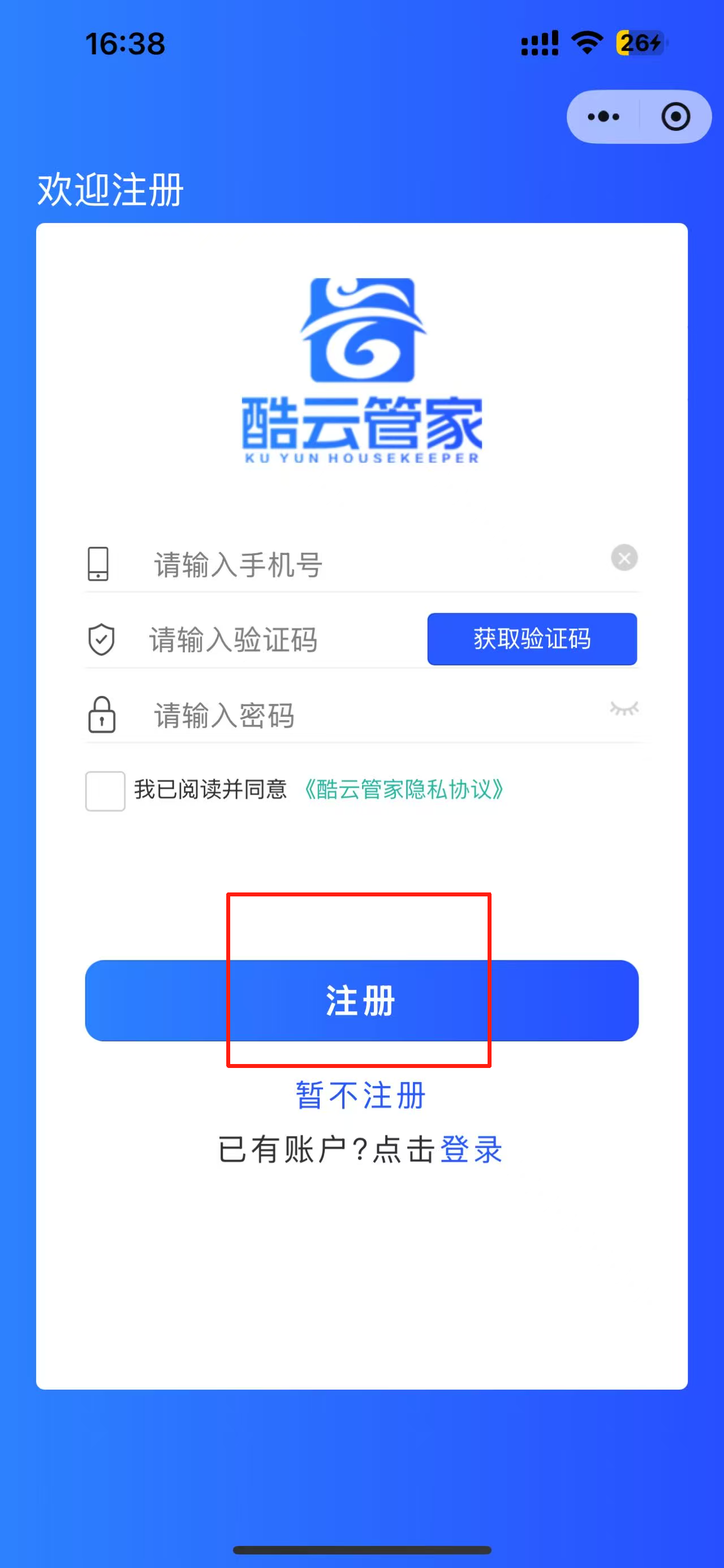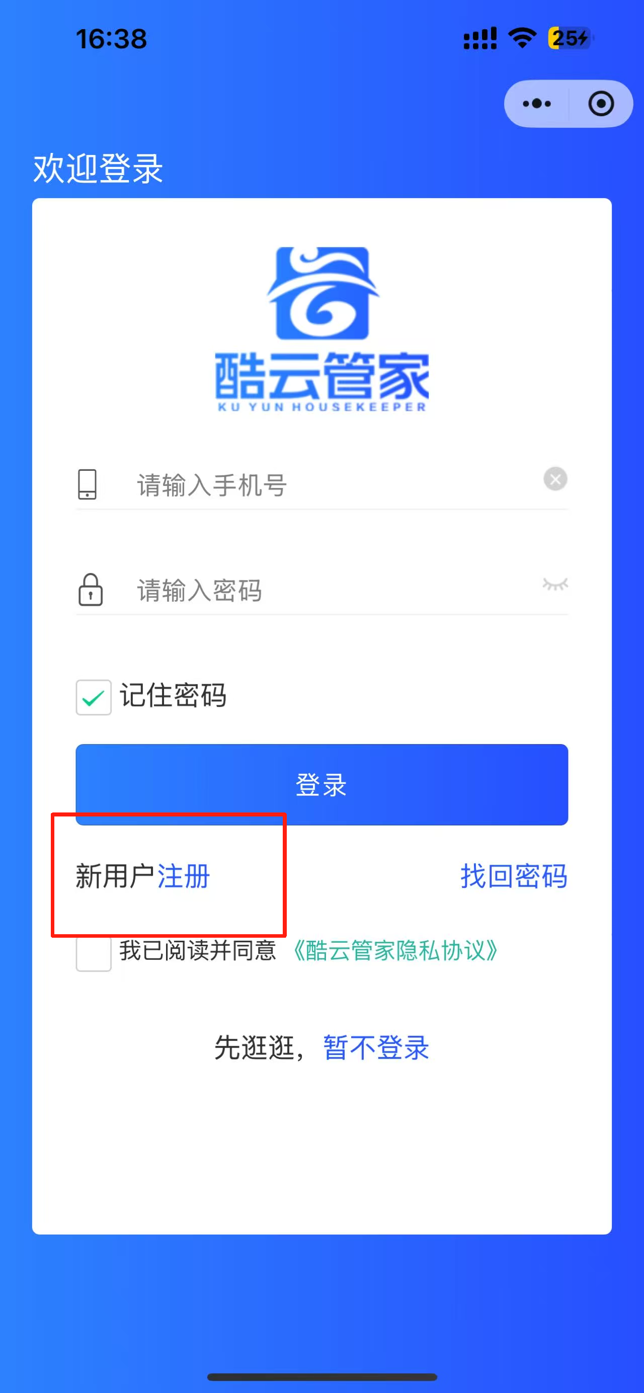 1、注册新用户。点击“新用户注册”按钮,输入手机号和验证码进行注册。
