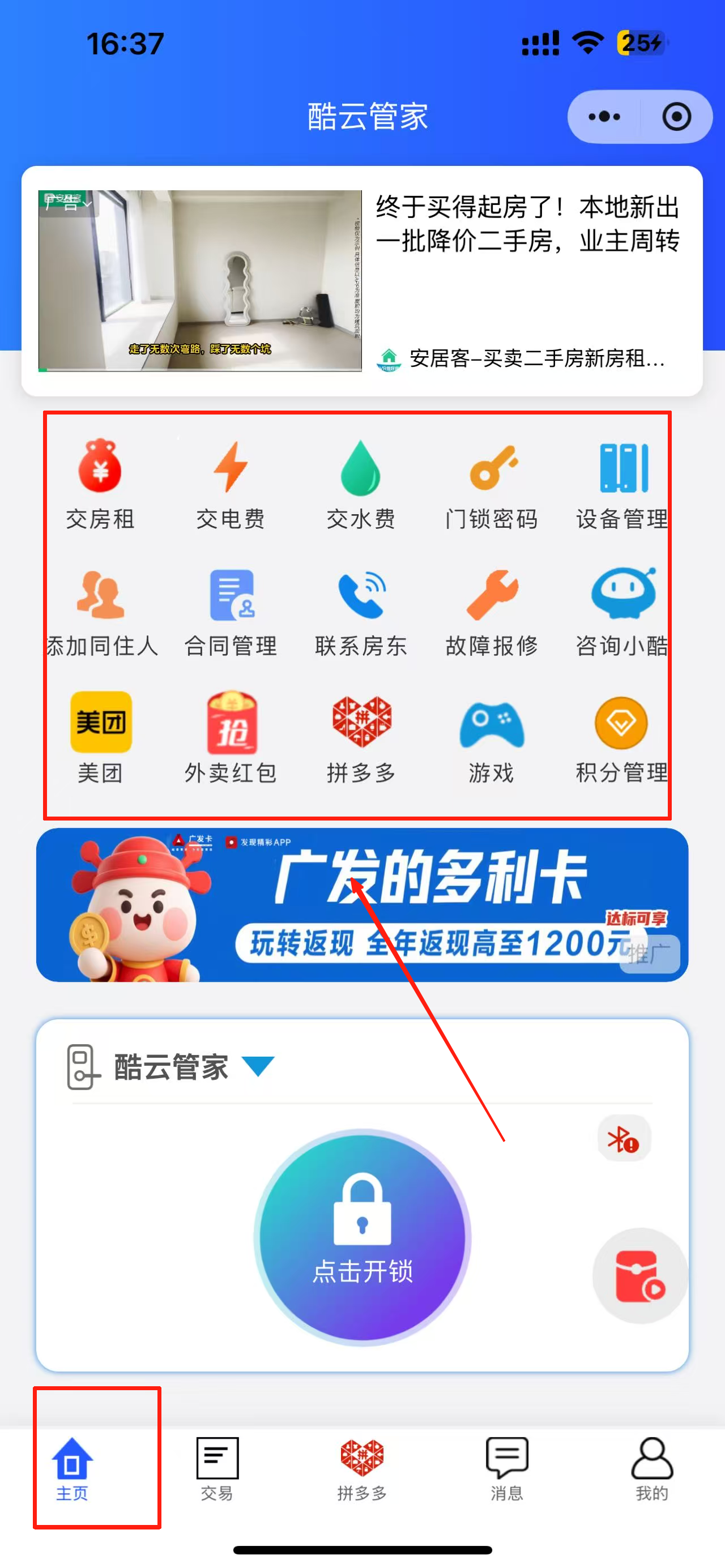 3、进入主页并选择功能。点击底部“主页”图标,选择房屋管理相关功能。