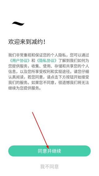 1、打开减约减肥APP,在用户协议页面点击同意并继续按钮。