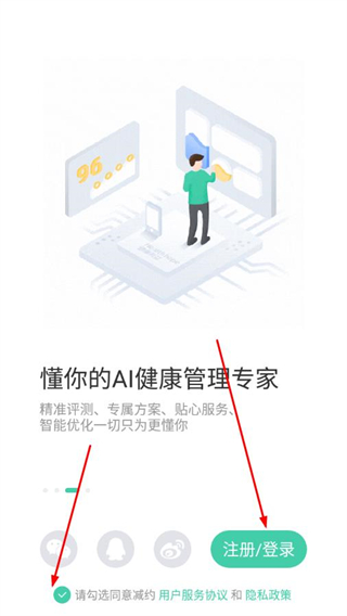 2、进入介绍页面后,勾选协议和隐私政策,点击注册/登录。