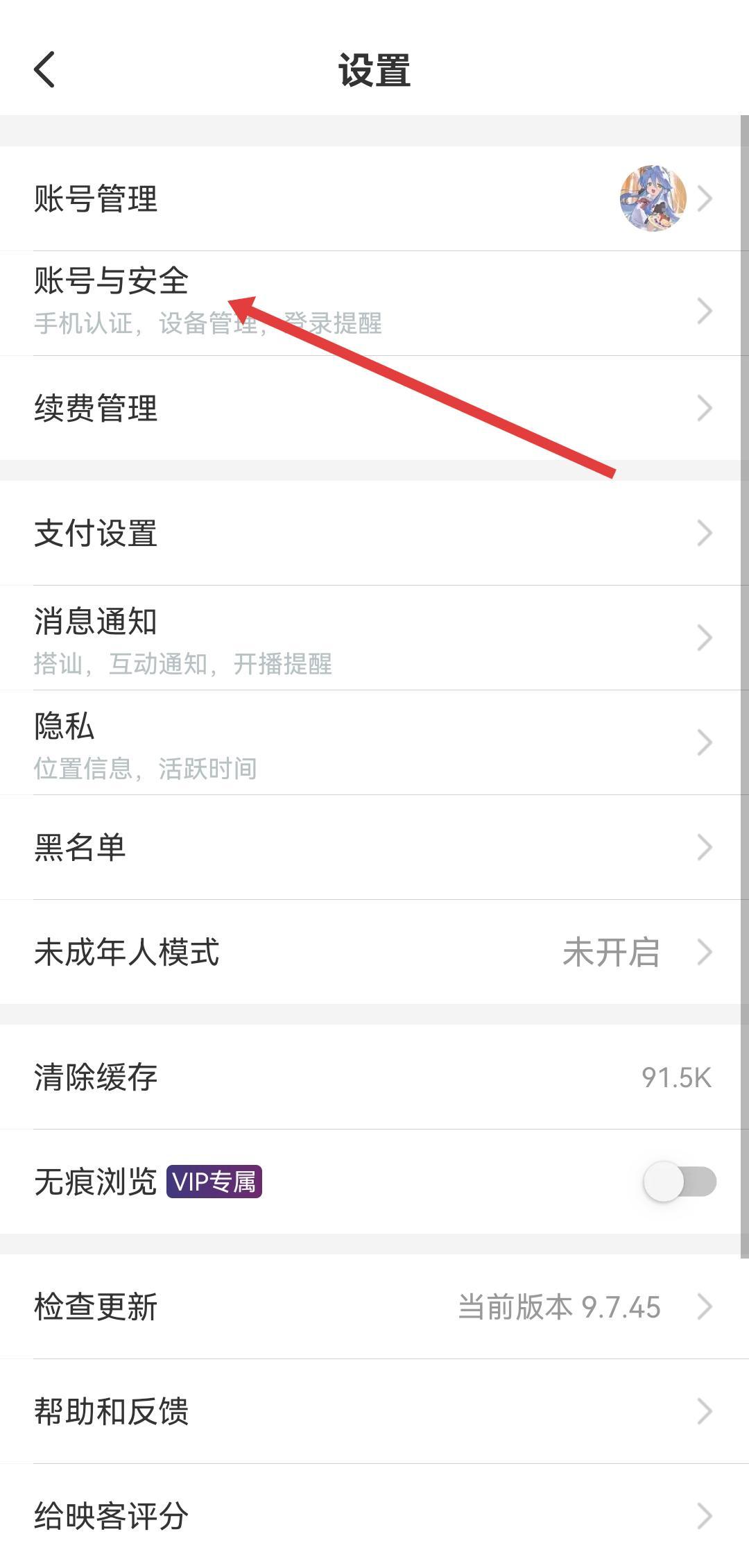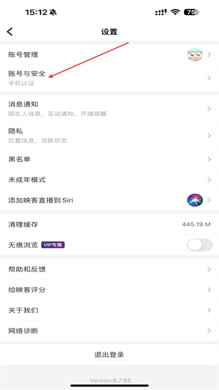 2、在设置页面中找到账号与安全选项并点击,该选项涉及手机认证、设备管理等账号安全相关设置。