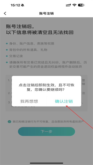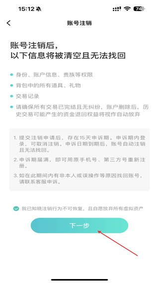5、在账号注销的界面内,了解规则后点击下方下一步的按钮。