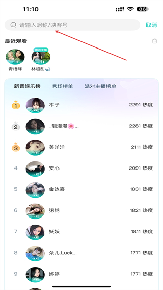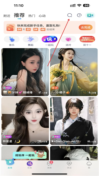 1、打开映客直播的APP,进入时点击右上搜索的图标。