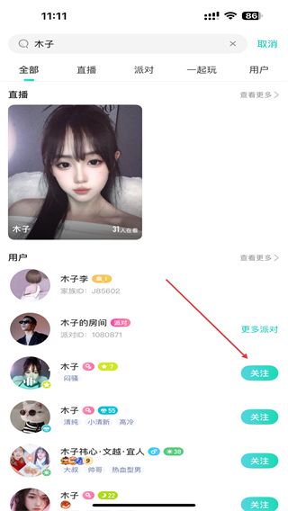3、输入后,在下方找到对应人物点击右侧关注按钮即可。