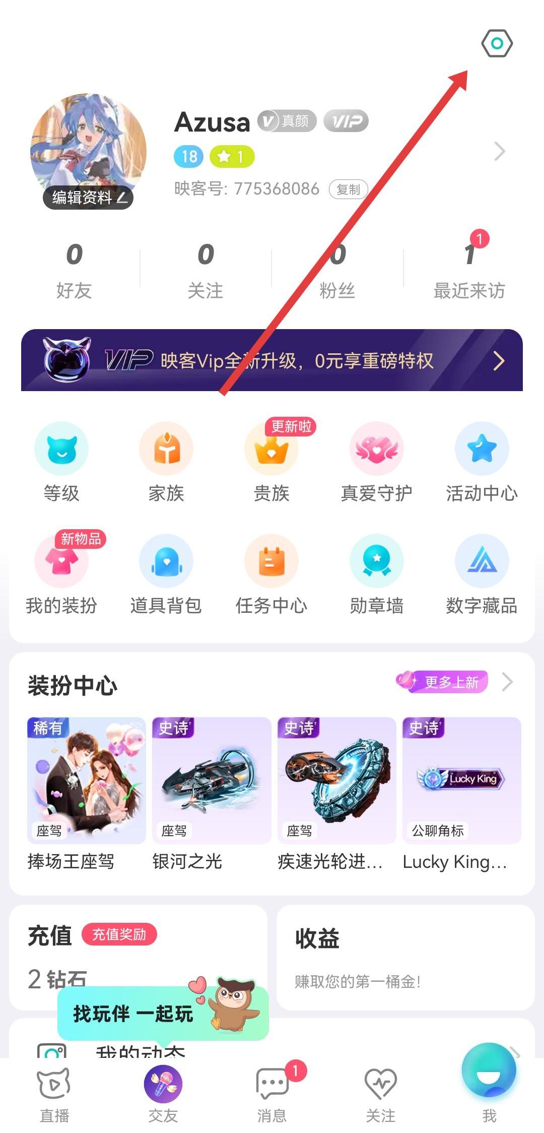 1、打开映客直播进入个人页面后,找到并点击右上角的设置图标,进入设置的界面。