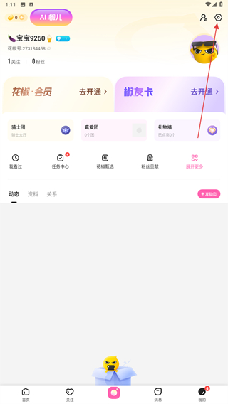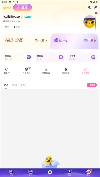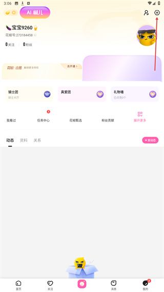 2、进入我的页面内,点击右上角设置的功能按钮。
