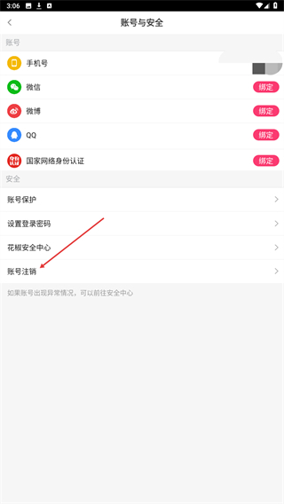4、在账号与安全页面中,向下滑动找到账号注销选项,即可完成。