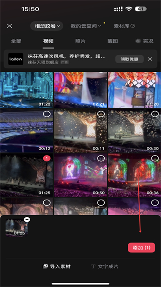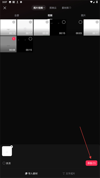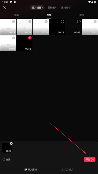 2、在相册中选中目标视频,点击添加进入视频编辑界面。