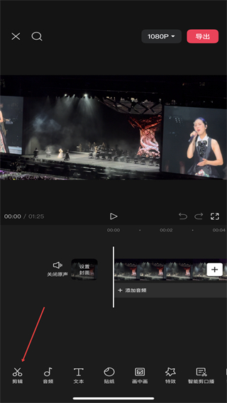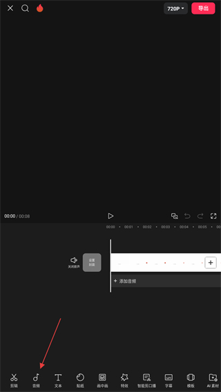 3、进入剪辑界面后,点击底部工具栏中的音频选项。
