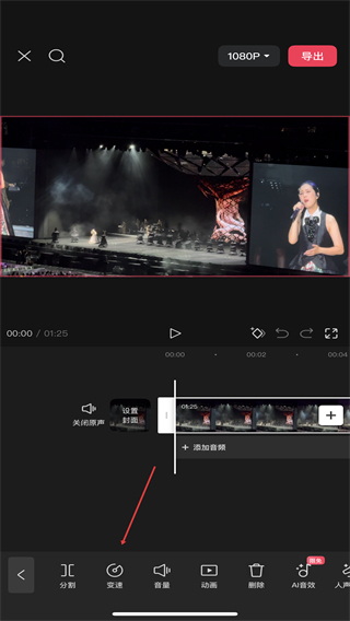4、在剪辑里,点击变速的按钮,进入视频倍速调整界面。